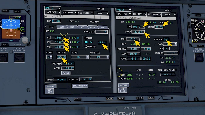 The aircraft needs a couple of parameters in the flight management system (FMS) to function correctly. We’re going to insert the bare minimum here, without any navigation route. If you already planned a route through the missions or through the navigation menu most data for the route is already inserted.