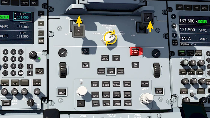 On the ECAM the takeoff checklist should now be shown. If you see any amber caution or red warning instead of the checklist check if you can fix the inoperative system or clear the caution/warning by clicking the CLEAR label on screen or by pressing the illuminated CLR button in the pedestal (aft of the engine ignition).