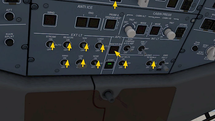 In preparation for the upcoming engine start let’s switch on external lights and passenger signs.