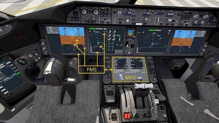 For route planning and long-term complex navigation functions the aircraft is equipped with a Flight Management System (FMS) that stores the flight plan and pre-programmed performance values and computes the most economical flight profile. Pilots can change the flight plan or enter values through either a Control-Display-Unit (CDU) or a Multi-Function-Display (MFD) in the cockpit.