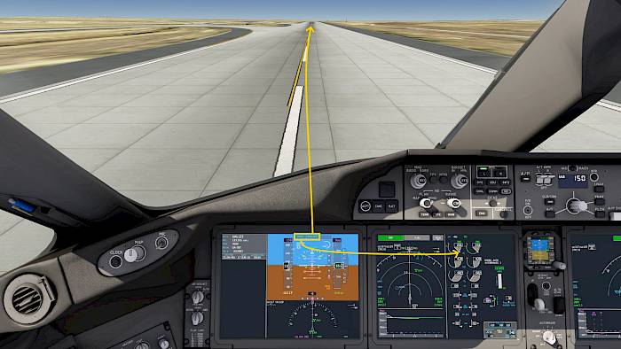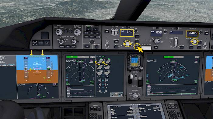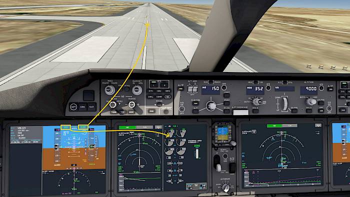 Below the FMA we find a status indication for the flight director (FLT DIR) and autopilot (AP, LAND 2 and LAND 3).