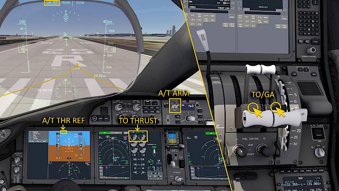 - When on the runway: Push the TO/GA switches on the thrust levers